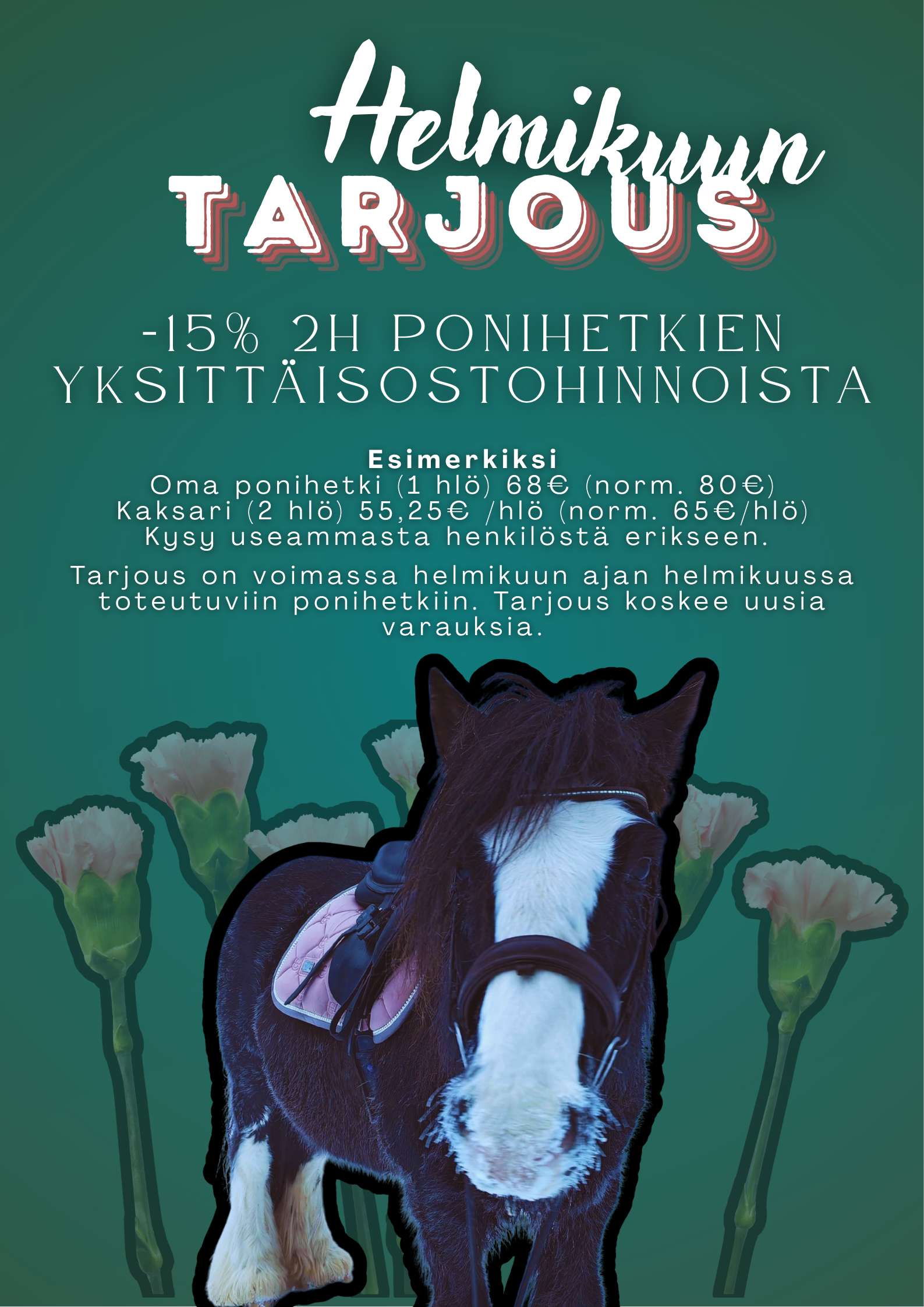 Palveluihimme kuuluvat muunmuassa ponihetket ja maastoratsastusretket, sosiaalipedagoginen ponitoiminta, ratsastuslomat ja ponileirit. Jos et löydä etsimääsi, kannattaa aina kysyä.