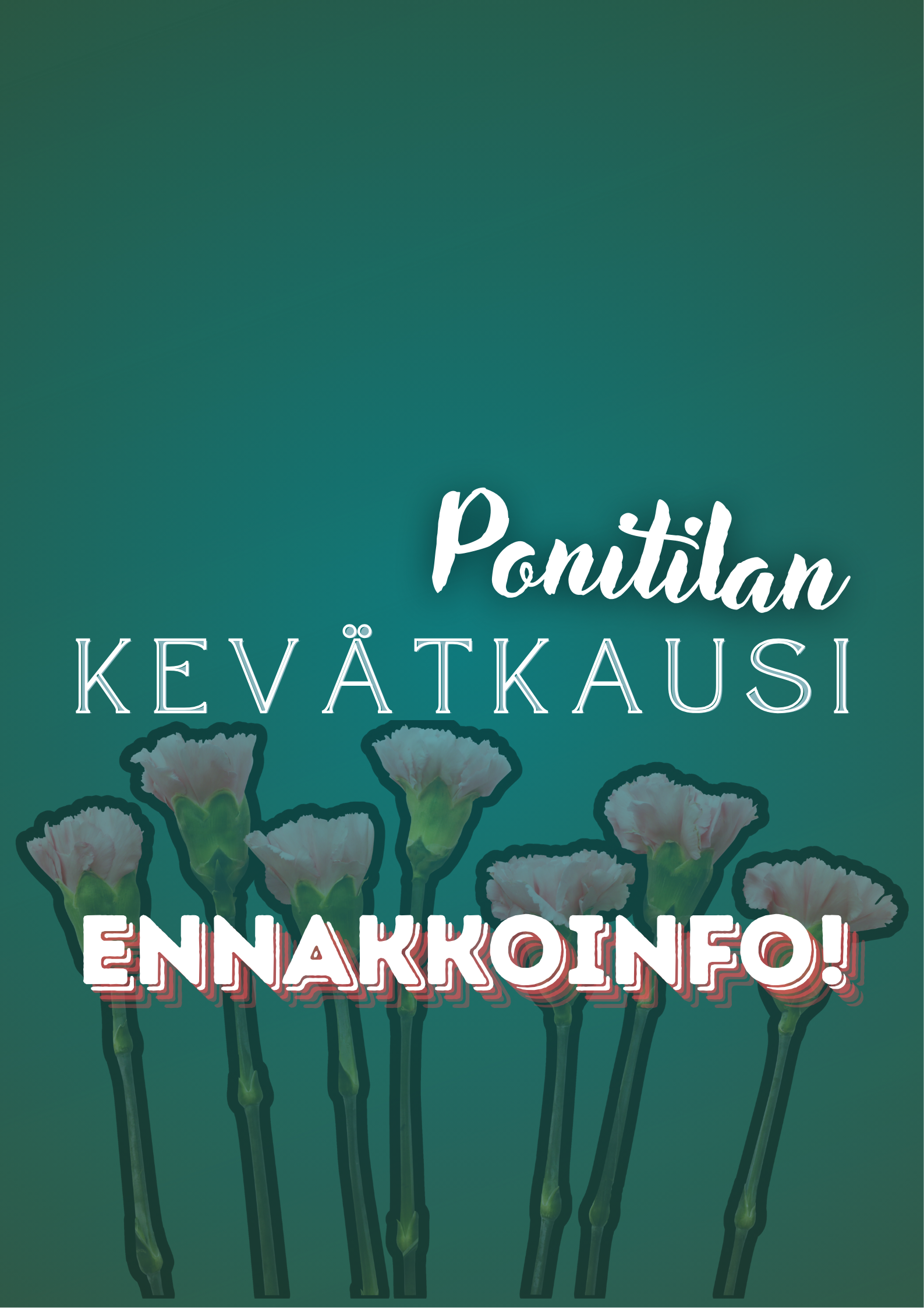 Ennakkoinfossa kevätkaudelle suunnitellut ryhmät. Näiden lisäksi voit varata yksityisiä ponihetkiä tai kaksareita omalle ryhmälle. Uutuutena 10. kerran kortti vakiotunneille.