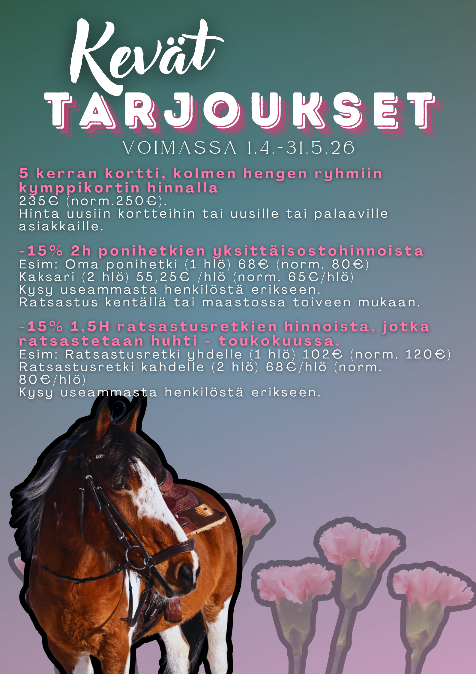 Palveluihimme kuuluvat muunmuassa ponihetket ja maastoratsastusretket, sosiaalipedagoginen ponitoiminta, ratsastuslomat ja ponileirit. Jos et löydä etsimääsi, kannattaa aina kysyä.