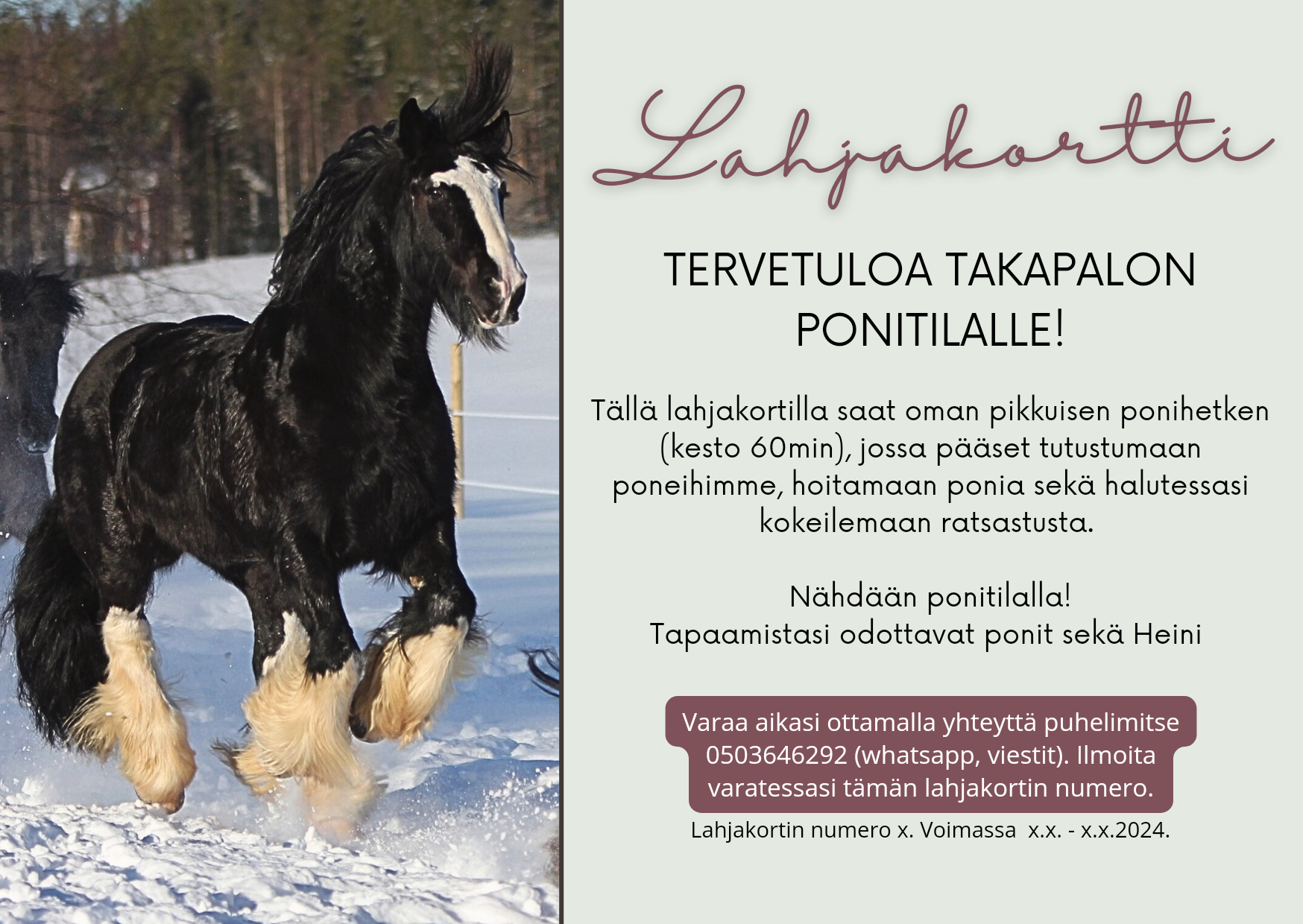 OMA PONIHETKI; oma yksilöllinen ponihetki joka viikko tai joka toinen viikko tai viiden kerran kortin käyttö 12 viikon sisällä ostopäivästä.