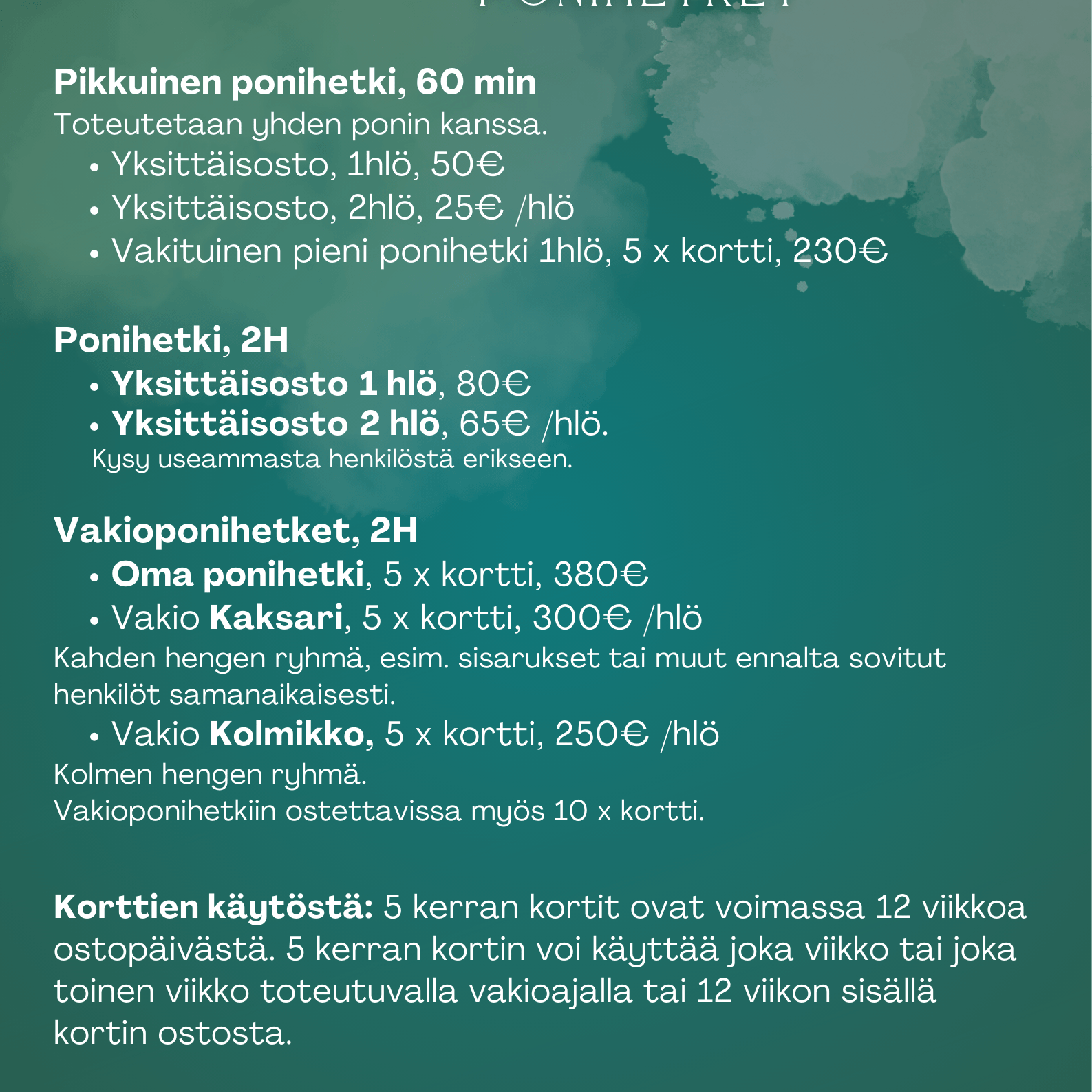 - Vakituinen pieni ponihetki 1hlö, 5 x kortti, 230 €