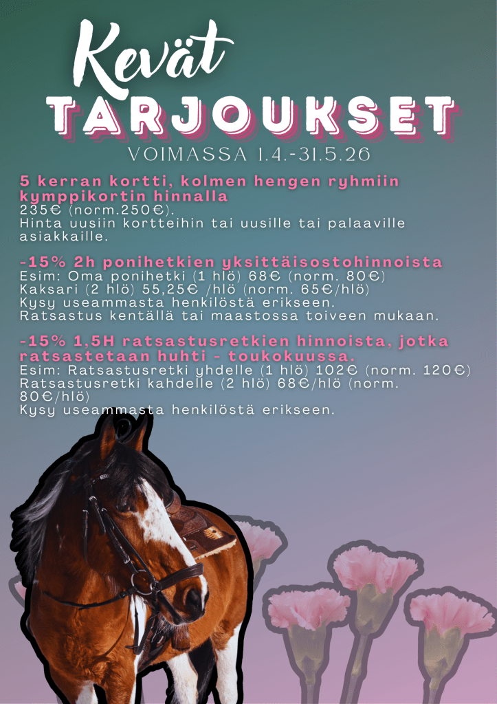 Palveluihimme kuuluvat muunmuassa ponihetket ja maastoratsastusretket, sosiaalipedagoginen ponitoiminta, ratsastuslomat ja ponileirit. Jos et löydä etsimääsi, kannattaa aina kysyä.